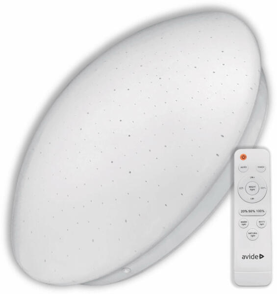 Avide mennyezeti LED lámpa Stella-CCT csillagos 80W Szabályozható Színhőmérséklet: Igen Anyaga: Műanyag+Fém Feszültség tartomány: 220-240 V Világítótest LED (várható élettartam 25000 óra) Teljesítmény: 80 W Hagyományos watt megfelelőség: 267 W Fényerő: 4800 lm Szabályozható fényerő: Igen Fokozatmentes színhőmérséklet állítás (3000K-6400K), Átmérő: 760 mm Mag