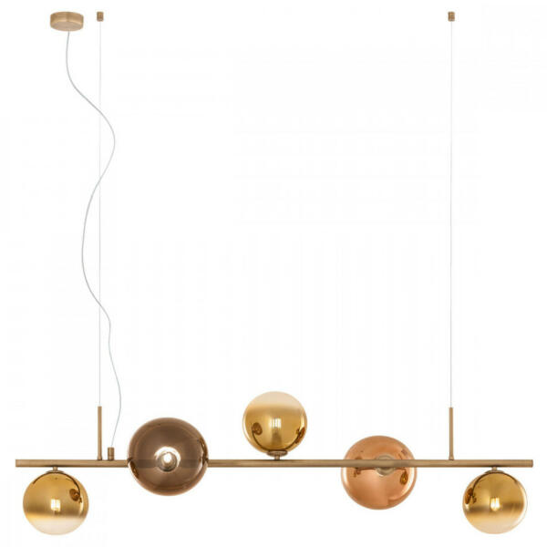 Patinás réz színű fém vázas függeszték lámpa gömb alakú üveg búrákkal, G9-es foglalattal. Az üveg búrák tükröződő felső résszel, arany és kávé színű színátmenettel rendelkeznek. A lámpát fényforrás nélkül szállítjuk.