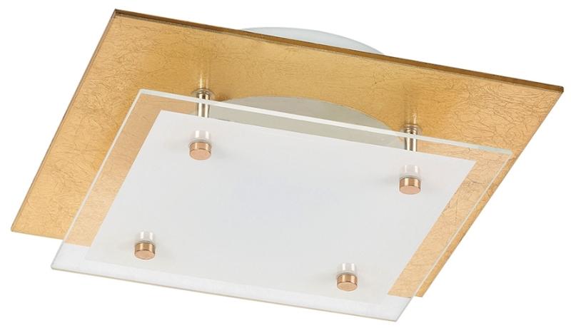 Minimalista stílusú, modern megjelenésű mennyezeti lámpa beépített energiatakarékos LED fényforrással. 23,5 x 23,5 cm széles, arany fólia és fehér színkombinációjú fém és üveg szerkezet. A beépített LED fényforrás A+ energiaosztály besorolású és 12W teljesítmény mellett 960 lumenes fényerőt, valamint 3000 Kelvines, természetes fehér színű fényt biztosít. 5 é