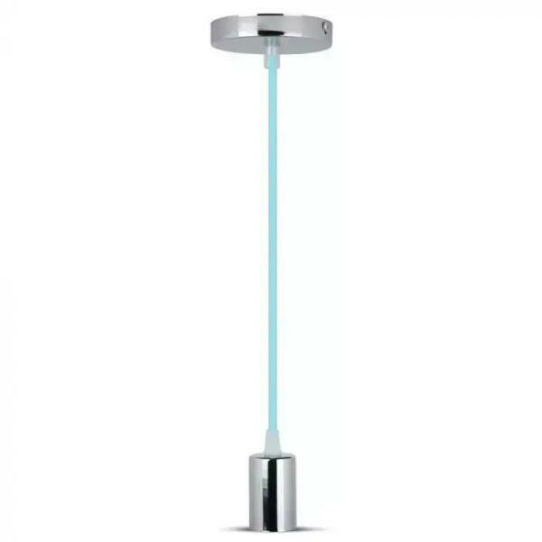 Minimal stílusú felfüggeszthető lámpa E27 aljzattal, fényes króm foglalattal és mennyezeti tárcsával, világoskék színű textilkábellel. A minimal lámpa olyan egyszerű megjelenésű, hogy bármely stílusú enteriőrbe beszerelhető! A lámpatest különlegességét a színes szövetkábel adja, amely jól kiemeli a lámpát a háttérből!A kör alakú mennyezeti rózsa 10 cm átm