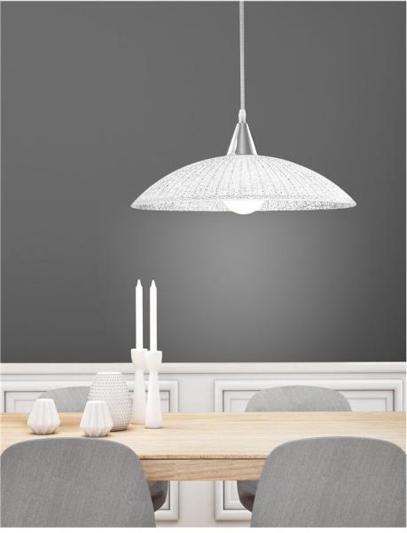 Modern stílusú függeszték króm színű fém felfogással. búrája fehér színű strukturált üveg. A lámpa hossza tetszőlegesen állítható a vezeték segítségével. Halogén, energiatakarékos és LED fényforrással is üzemeltethető, mely nem tartozék. Specifikációk:Gyártó : Nova Luce Cikkszám:: NL-7326501 Foglalat: 1 x E27 Méret (ma x sz x mé): 1000 x 400 x 0 mm IP-védet
