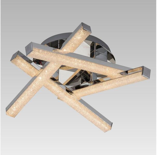 Króm színű fém vázas mennyezeti lámpa kristály effektes műanyag karokkal, beépített LED fényforrással.