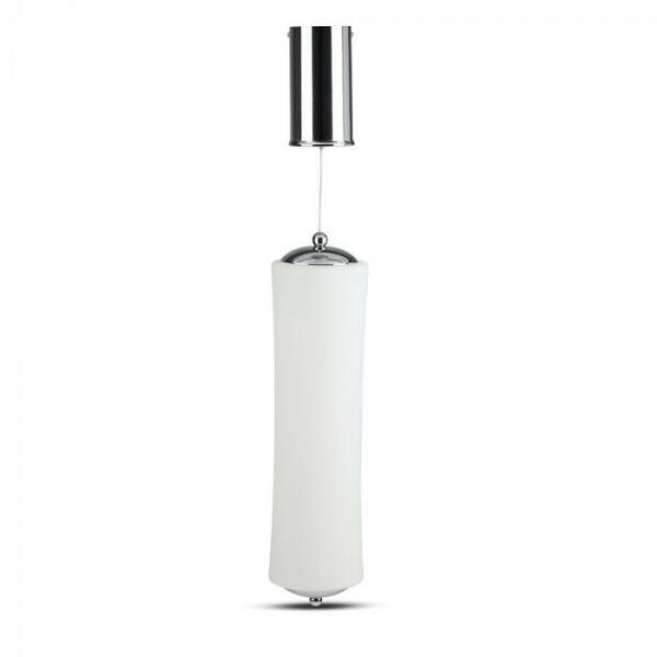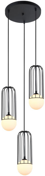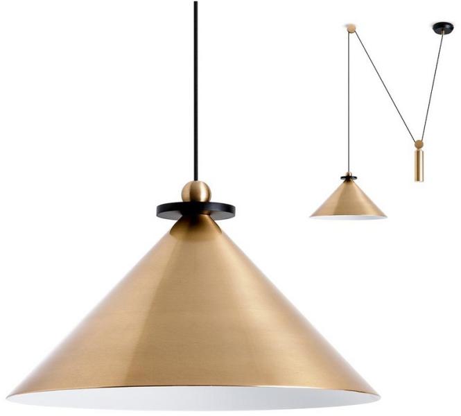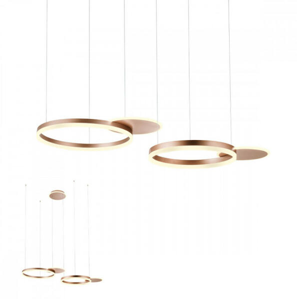 Barnaszínűalumínium és fém vázas függeszték lámpa fehér színű akril betétes búrával. A lámpába beépített led modulok vannak elhelyezve, melyek meleg fehér színben világítanak. A lámpa fényereje fali kapcsoló segítségével 3 fokozatban szabályozható.