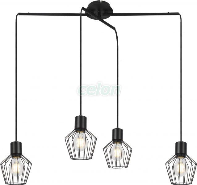 Az indusztriális stílusú Belano négyes függeszték modern nappalink, hálószobánk vagy dolgozószobánk berendezésének jellegzetes darabja lehet. A teljes egészében fémből készült, matt fekete lámpát a rácsos búrák teszik különlegessé és kerek dísztalp segítségével rögzíthető a mennyezeten. A két-két lámpafej két, egymásra merőleges tengelyről csüng lefelé.