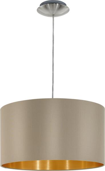 Ezt a Maserlo függesztett lámpát az Eglo gyártja. Kívül szürkésbarna, belül arany textil burája 380 mm átmérőjű, a maximális belógása pedig 1100 mm. A belógás magasságát te állíthatod: ha magasabbra szeretnéd húzni, a felesleges kábelmennyiséget tekerd a mennyezethez csatlakozó pogácsába. Súlya közel másfél kg. A lámpa egy fényponttal rendelkezik, foglalata E27