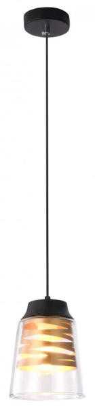 A modern stílusú Zenaida egyes függeszték modern nappalink, hálószobánk, étkezőnk vagy akár konyhánk berendezésének ízléses darabja lehet. A fémből készült, matt fekete lámpatestet átlátszó üvegbúra egészíti ki, amelynek belsejében aranyszínű, szalagszerű dekoráció veszi körbe a fényforrást. A lámpa kerek, matt fekete dísztalp segítségével rögzíthető a m