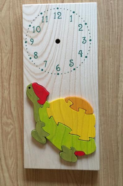 Kőrisfából készült gyermek óra. 2 csavar segítségével a falra rögzíthető. Méretei: 16 cm széles, 34 cm magas
