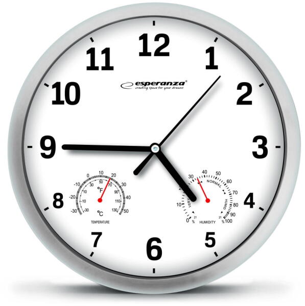 Ez az óra nem csak a pontos időt mutatja, hanem a szobahőmérsékletet és a páratartalmat is. Rendkívül elegáns és stílusos kialakításának köszönhetően kiválóan alkalmas lakások, irodák, üzletek vagy éttermek díszítésére. Átmérő: 25 cm Vastagság: 3,6 cm Anyag: műanyag keret Óra tárcsás lemez: art papír Tápegység: 1x AA elem... Ez az óra nem csak a pontos időt
