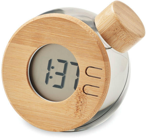 Vízzel működő bambusz LCD óra Nagy kijelzős LCD óra bambusz részletekkel. A termék működtetéséhez nincs szükség elemre, csak sós vízzel való feltöltésre (3 g só szükséges). A bambusz természetes anyag, színében, mintázatában és méretében esetenként eltérő lehet.