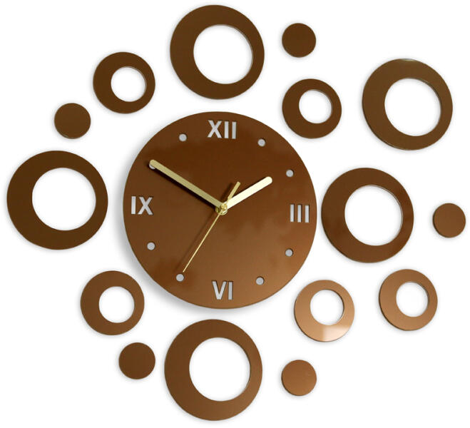 Modern falióra RINGS COPPER HMCNH008-copper Modern dekorátív falióraAz órák PMMA akril üvegből készülnek. Ez az anyag modern és esztétikus, könnyű és hatszor erősebb az egyszerű üvegnél. Kitűnő dekorációs kellék, tökéletesen tükrözi a napfényt. Ellenálló az UV sugarakkal szemben és az anyag tulajdonságainak köszönhetően nem igényel különösebb törődést és
