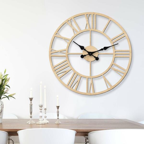 Nagy falióra római számokkal a nappaliba, ahol modern és praktikus dekorációvá válik. Biztosak vagyunk benne, hogy a fa óránkba azonnal beleszeret, és minden térben elegáns díszítőelemként fog szolgálni. A szerkezet csendes járásának köszönhetően a nagy faliórát a hálószobába vagy a konyhába is elhelyezheti. Az Ön választása szerinti minta és a fekete mutatók egy