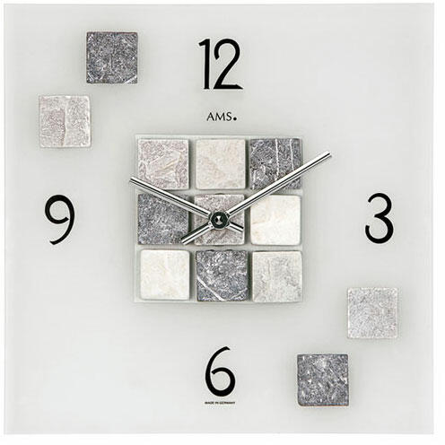 Csodálatos szürke árnyalatú természetes kövekkel díszített matt (szatén) üvegből készült modern AMS falióra. A német AMS üveg falióra mérete: 30x30cm