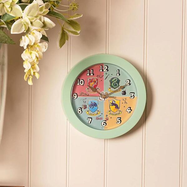 Harry Potter Wall Clock – Four Houses (Glow In The Dark)A Hogwarts crest wall clock by WARNER BROS®. This delightful wall clock is a smile-raising gift for the bedroom of little wizards. The clock stands out with its turquoise frame and fantastic glow-in-the-dark clock face design which showcases each of the four Hogwarts house crests: Gryffindor, Hufflepuff, Slytherin and Ravenclaw. The Arabic