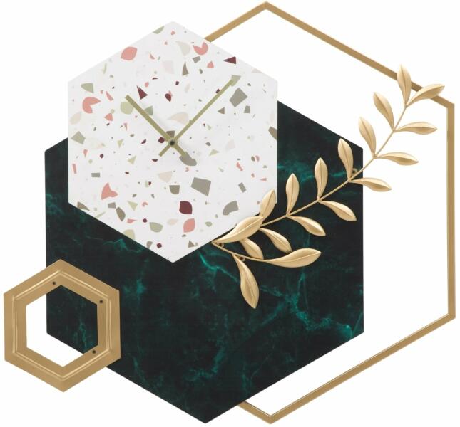 A látványos HEXA faliórával nappalid vagy étkeződ is ékesítheted. Az átlapolt fehér, mélyzöld és aranyszínű hatszögek feszes hatását az ágat formázó díszítőelem töri meg. Már-már egy absztrakt művészeti kompozíciónak hat, mely biztosan elnyeri a kortárs stílus kedvelőinek tetszését. Többek közt remek párost alkothat egy dizájnban passzoló konzolasztallal. L