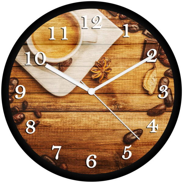 30 cm átmérőjű műanyag falióra, átlátszó üvegburávalcsendes, folyamatosan járó óraszerkezetnyomdai minőségben nyomtatott óralapszínes fém mutatókkartondoboz csomagolásAz óra 1 db AA ceruzaelemmel működik. A csomag elemet nem tartalmaz!Az órát összeszerelve, működésre készen szállítjuk, neked csak a helyére kell akasztanod és gyönyörködni benne!