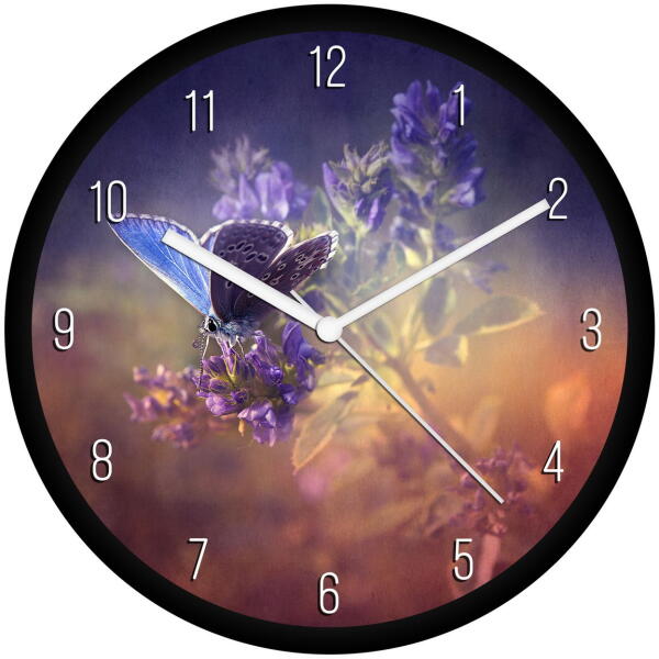 30 cm átmérőjű műanyag falióra, átlátszó üvegburávalcsendes, folyamatosan járó óraszerkezetnyomdai minőségben nyomtatott óralapszínes fém mutatókkartondoboz csomagolásAz óra 1 db AA ceruzaelemmel működik. A csomag elemet nem tartalmaz!Az órát összeszerelve, működésre készen szállítjuk, neked csak a helyére kell akasztanod és gyönyörködni benne!