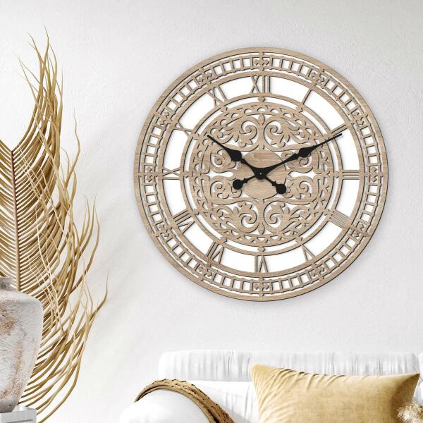 Nagyméretű falióra - Majestique ötvözi a kidolgozott tervezést és a funkcionalitást. Az óralap római számokat tartalmaz és díszített ornamentikával és precízen kivágott részletekkel van ellátva, amelyek kiemelik a kívánt vintage stílust. A vintage óra tökéletes választás a konyhába vagy a nappaliba, ahol bármelyik falon azonnal szembetűnő díszítő darabbá válik.