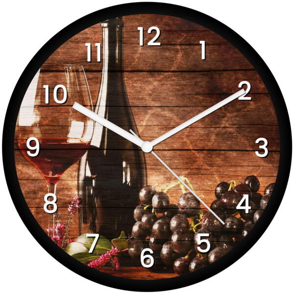 30 cm átmérőjű műanyag falióra, átlátszó üvegburávalcsendes, folyamatosan járó óraszerkezetnyomdai minőségben nyomtatott óralapszínes fém mutatókkartondoboz csomagolásAz óra 1 db AA ceruzaelemmel működik. A csomag elemet nem tartalmaz!Az órát összeszerelve, működésre készen szállítjuk, neked csak a helyére kell akasztanod és gyönyörködni benne!