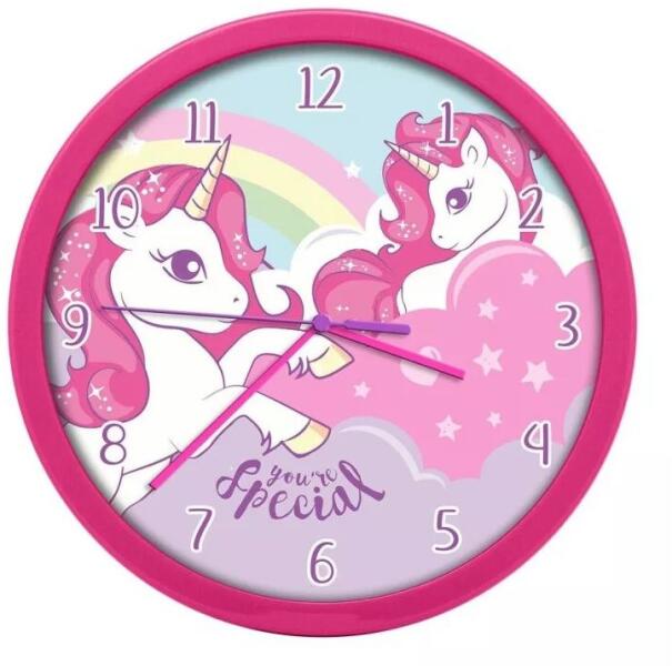 Ez a gyönyörű, unikornis mintás falióra tökéletes választás minden kislány számára, akik imádják a varázslatos világot és az aranyos dizájnt. Unikornis falióra Az óra számlapján két bájos unikornis található, akik színes szivárvány és felhők között játszanak, alatta pedig a kedves "You're special" felirat látható, amely minden nap emlékezteti a gyerekeket arra,