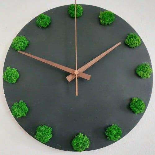 A matt felületű fekete beton, a diófa mutatók és a zuzmó találkozása stílusossá teszi otthonod. Súlya: 1480g Anyaga: Beton Mérete: 29cm Mutatók anyaga: fa Mutatók száma: 3 Elem: 1.5V AA ceruzaelem (nem tartozék)