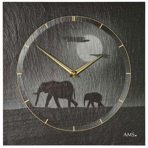 Gyönyörű, természetes palából készült falióra szürke és fehér airbrush design afrikai elefántos tájképpel. A természetes palából készült falióra mérete: 30x30cm, súlya 2kg.