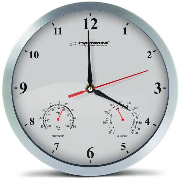 A csomag tartalma:- 1 db Falióra, 30,5 cm, páratartalom mérővel, hőmérővel, fehér számlap, SECCO, króm keret"Sweep second" - folyamatosan járó csendes, elemes óraszerkezet átmérő: 30,5 cm kerek forma króm színű, műanyag keret analóg, fehér számlap fekete arab számokkal hőmérséklet és páratartalom mérő energiaellátás: 1 db "AA" ceruzaelemmel működik (nem tartozék