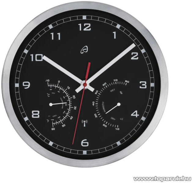 - előlapja üveg - automata átállás téli / nyári időszámításra - hőmérséklet és a levegő páratartalmának mérése - fekete hátlappal, inox kerettel Frankfurti DCF-77 rádiójel vezértlésű analóg falióra; mely sosem késik, mindig automatikusan beáll a pontos időre, és átáll téli / nyári időszámítás esetén! Hőmérsékletet és páratartalmat mechanikusan mér. Je
