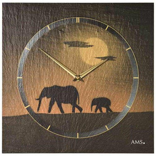 Gyönyörű, természetes palából készült falióra arany és narancs airbrush design afrikai elefántos tájképpel. A természetes palából készült német AMS falióra mérete: 30x30cm, súlya 2kg.
