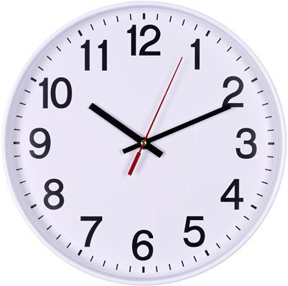 Műanyag falióra -kerek fehér számlap -műanyag előlap -modern design, arab számok -fekete mutatók, piros másodperc mutató -1 db AA elemmel működik -átmérő: 30 cm -vastagság: 4 cm -szín: fehér