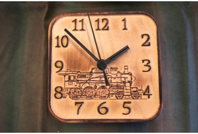 Ezt a juharfa órát a belegravírozott gőzös mozdony díszíti. A Mozdony és a számok kiemelkednek az óra síkjából. A színezést égetéssel értük el. Méret:14x14x3 cm Tömeg:250 g www. fajandekok. hu