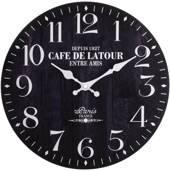 Anyaga: bakelit lemez Óraszerkezet: csendes, fém mutatókkal Mérete: 30cm átmérő Működése: 1db AA elemmel (1,5V-os ceruza elem)nem tartozék
