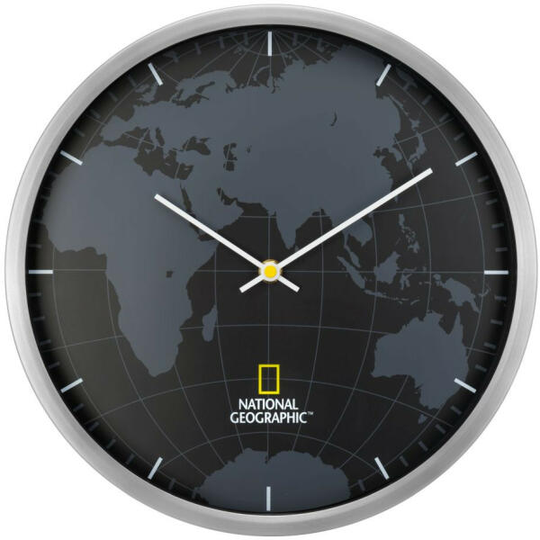 A szálcsiszolt alumínium kerettel és a diszkrét fekete-szürke világtérképpel ellátott NATIONAL GEOGRAPHIC falióra tökéletesen illeszkedik minden nappaliba. A csendes működésének köszönhetően a hálószobájában is elhelyezhető anélkül, hogy zavarná az éjszaka nyugalmát. JELLEMZŐK: falióra manuálisi időállítással csiszolt alumínium keret tömör számlap óra- és