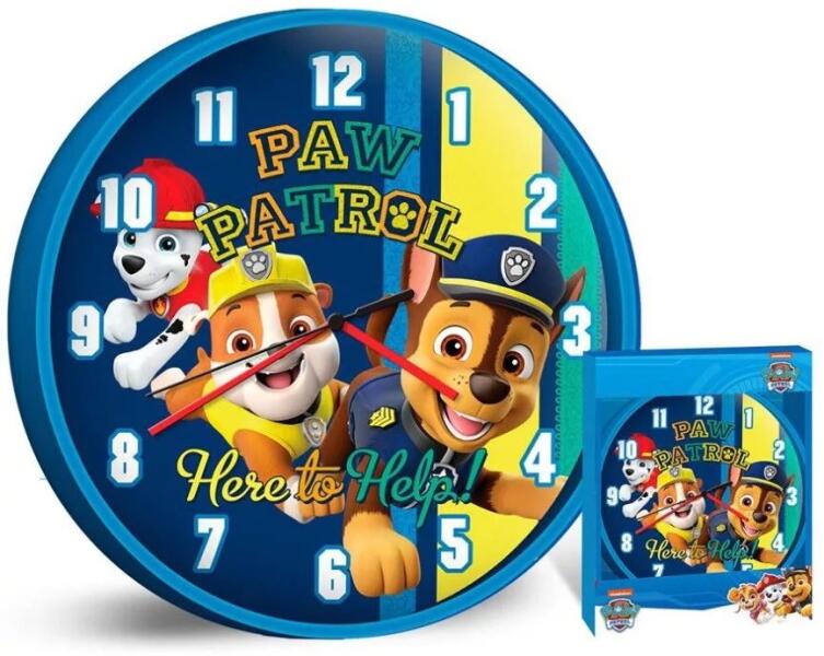 Ez a Paw Patrol témájú falióra tökéletes választás minden Mancs Őrjárat rajongó számára! Mancs Őrjárat falióra Az óra számlapján Chase, Marshall és Rubble vidám arcai köszönnek vissza, készen állva, hogy segítsenek. A "Here to Help!" felirat emlékezteti a gyerekeket a csapat segítőkészségére és a közös kalandokra. Az élénk kék és sárga színek modern és vid