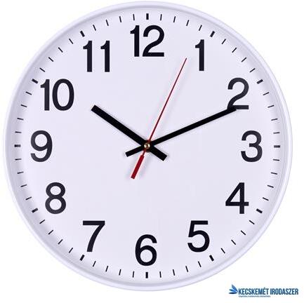Műanyag falióra -kerek fehér számlap -műanyag előlap -modern design, arab számok -fekete mutatók, piros másodperc mutató -1 db AA elemmel működik -átmérő: 30 cm -vastagság: 4 cm -szín: fehér