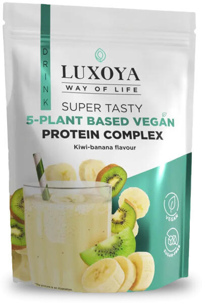 Luxoya super tasty 5-plant based vegan protein complex - 5 féle növényi fehérjeforrást tartalmazó vegán fehérje italpor 450 g - Kivi-banán ízű. A SUPER TASTY 5-PLANT BASED VEGAN PROTEIN COMPLEX termékünk 5 különböző növényi fehérje forrás különleges keveréke. Elkészítési javaslat: Keverjen el 30g italport 200 ml hideg vízben. Elkészítését vízzel ajánluk, mert víz
