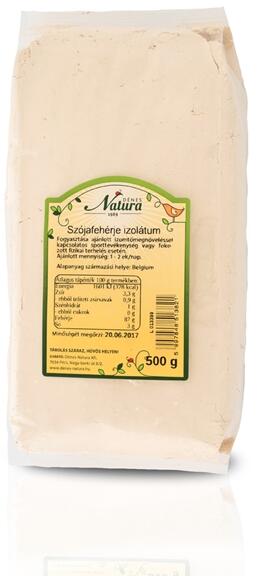 Natura szójafehérje izolátum 500gAllergének a termékben: szója. Átlagos tápérték 100 g termékben:Energia 1601 kJ (378 kcal)Zsír 3,3 g- amelyből telített zsírsavak 0,9 gSzénhidrát 1 g-amelyből cukrok 0 gFehérje 87 gSó 3 gFelhasználási javaslat:Fogyasztása ajánlott izomtömegnöveléssel kapcsolatos sporttevékenység vagy fokozott fizikai terhelés esetén. Ajánlott mennyis