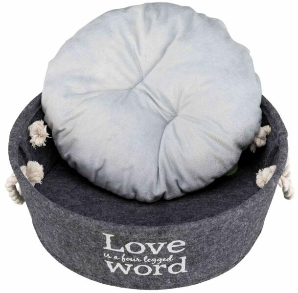 Trixie Lian egy kerek kutyaágy stabil formával és puha párnával macskák és kistestű kutyák számára. csavart pamutkötélből készült dekoratív fogantyúkkal stabil forma a megerősített szélnek köszönhetően szigetel a hideg padlótól steppelt párna plüss huzattal és poliészter gyapjú töltettel a párna kézzel mosható m