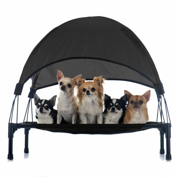 Kényelem stílussal, kutyafekhely napellenzővel Tetős kutyaágyunk nemcsak optimális kényelmet, hanem stílusos pihenést is kínál kutyájának a szabadban. Az elegáns fekete harmonikus szín tökéletesen illeszkedik bármilyen környezetbe, míg az innovatív dizájn a napellenzővel fokozott védelmet és kényelmet biztosít. A kutyaágy mérete napernyő nélkül 60 x 45 x 16 cm, míg