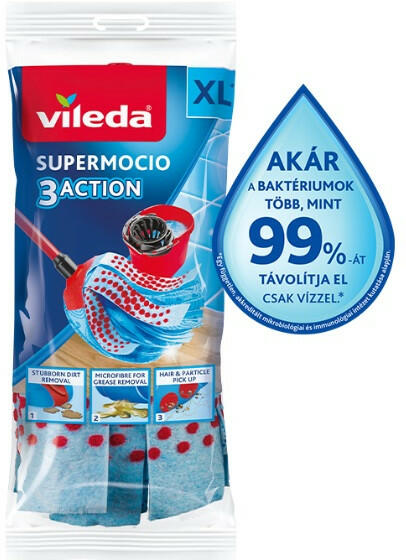 A mikroszálas Vileda 3Action gyorsfelmosó utántöltő három fő tisztítási funkciót kínál az igazán alapos takarításhoz, és kizárólag víz használatával távolítja el a baktériumok 99%-át*. A piros súrolópárnával karcmentesen szabadulhat meg a makacs szennyeződésektől, a kék mikroszálas zónával eltávolíthatja a zsíros koszmaradványokat, a nagy teljesítményű pi