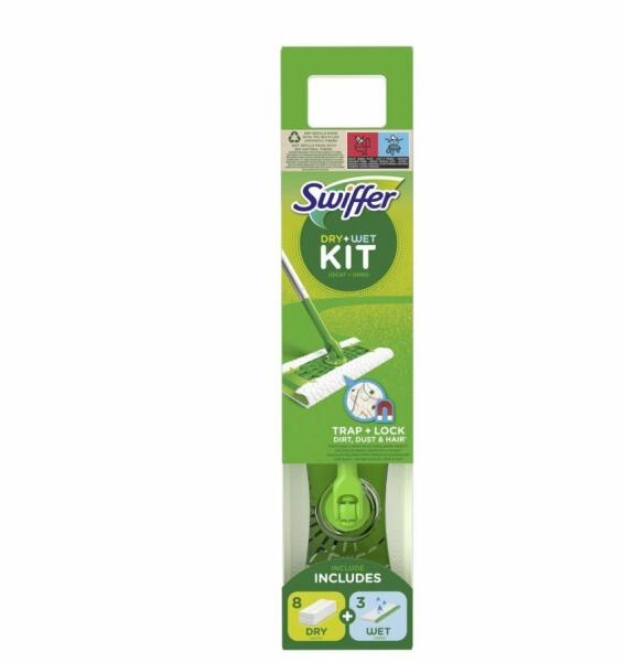 SWIFFER DRY + WET KIT A várva várt megoldás végre megérkezett: egyetlen eszköz a padló sepréséhez és felmosásához. A Swiffer Sweeper kezdőkészlet 8 db vastag, száraz törlőkendőt tartalmaz, amely háromszor több kosz, por és szőr