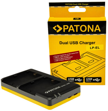 PATONA Dual Charger for Canon LP-EL Speedlite EL-1 EL-5 USB-C kábellel Rendkívül kompakt kialakításának köszönhetően a PATONA USB kettős töltő ideális utazó vagy professzionális felhasználók számára is. Praktikus és megbízható társ minden digitális fotózáshoz. Egyszerre 2 akkumulátor töltésére van lehetőség. A töltő bármely szabványos USB-porton keresztül tápl