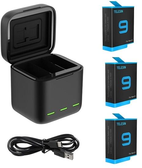 Telesin GP-BNC-902 3 foglalatos töltő 3 akkumulátorral GoPro Hero 9 / Hero 10 készülékekhez Kényelmesen tárolhat és tölthet egyszerre akár 3 akkumulátort a GoPro Hero 9 / Hero 10 számára? Most már lehetséges! A Telesin GP-BNC-902 hordozható 3 csatornás töltő teljesítményével és biztonságos használatával lep meg. Lehetővé teszi mind a 3 akkumulátor feltöltését mind