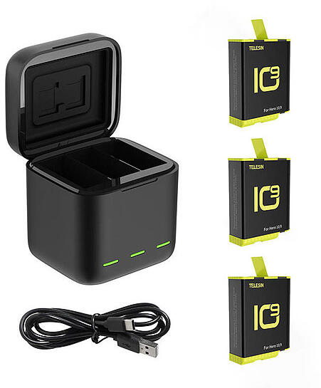 Márka: Telesin | Modell: GP-BNC-902-B | Töltő súlya: 27 g | Az akkumulátor súlya: 13 g | Kompatibilitás: GoPro Hero 9/Hero 10 | Bemeneti áram: 5 V - 2,4 A | Kimeneti áram: 4,4 V 800 mA x3