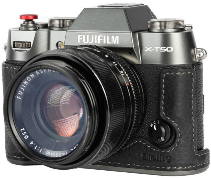 A Fujifilm X-T50 fényképezőgéphez Bőr féltok Levehető vállpánt Integrált habszivacs markolat Szarvasbőr bélés a karcolás elleni védelemért Nem blokkolja a fényképezőgép kulcsfontosságú komponenseit Alumínium keret az ütésvédelemért 1/4"-20 hüvelykujjas csavar 1/4"-20 állványmenet Védje és hordozza Fujifilm X-T50 fényképezőgépét a SmallRig fekete bőr féltok k