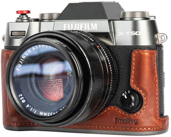 A Fujifilm X-T50 fényképezőgéphez Bőr féltok Levehető vállpánt Integrált habszivacs markolat Szarvasbőr bélés a karcolás elleni védelemért Nem blokkolja a fényképezőgép kulcsfontosságú komponenseit Alumínium keret az ütésvédelemért 1/4"-20 hüvelykujjas csavar 1/4"-20 állványmenet Védje és hordozza Fujifilm X-T50 fényképezőgépét a SmallRig barna bőr féltok ké