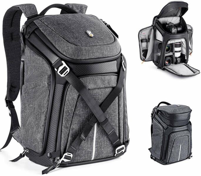 K&F Concept Alpha 25L Photo Backpack (KF13.105) The K&F Concept Alpha photo backpack is distinguished by its large capacity (25L), which allows it to store up to two cameras, four lenses, a 15.6-inch laptop and a 12.9-inch iPad. Special compartments are dedicated to a tripod and other essential photographic accessories. Thanks to the waterproof material and additional rain cover, your equi