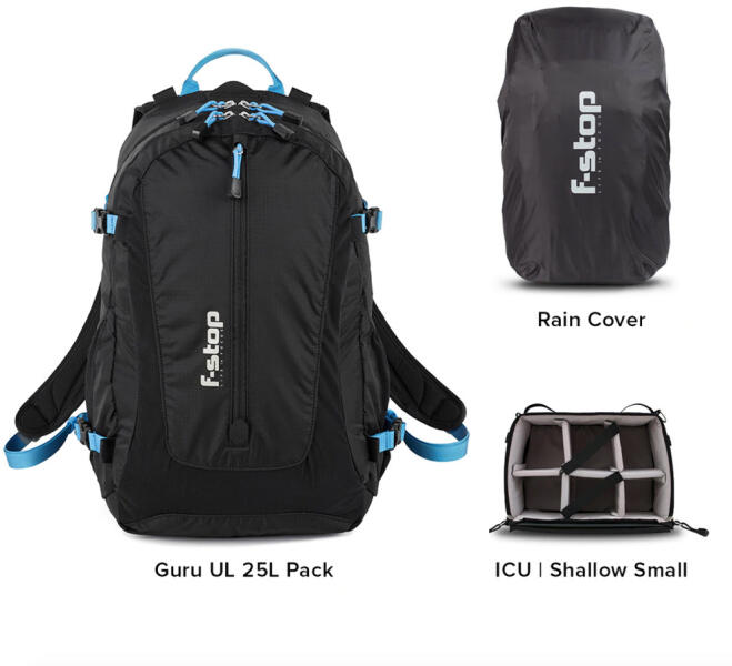 F-Stop Guru UL Hátizsák - 25L Fotós Táska (fekete / kék) + Esővédő Hátizsákra Az F-Stop Guru UL hátizsák egy könnyű táska aktív fotósok számára, akik ideális megoldást keresnek felszerelésük biztonságos szállításához. A dizájn stílusos, de rendkívül funkcionális. Így könnyedén magával viheti objektívvel, kiegészítő objektívekkel, vakuval és állvánnyal e