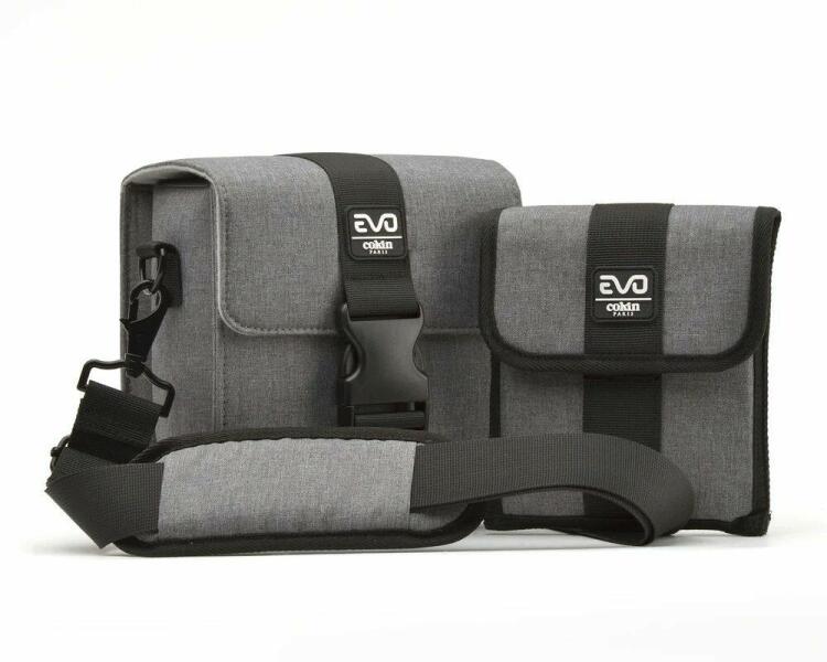A Cokin EVO szűrőtartó (L) tokba 5db lapszűrő fér egy kis tokban és 3db szabadon állítható részbe tehető a szűrő tartó, gyűrűk, plusz szűrő. A tok tartalmaz még egy esővédő huzatot és egy válpántot.