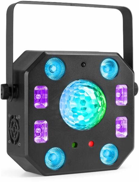Műszaki adatok: - 5 az 1-ben effekt Jelly ball, PAR, UV fény, stroboszkóp és lézer effekttel - Jelly Ball effekt nagy teljesítményű 12W RGBW LED-del - PAR effekt 4x 6W RGBW LED-ekkel - Lézervörös (120mW) és zöld (30mW) - UV / fehér LED kombináció 4x 3W LED-del - IR távirányító - DMX és önálló mód - Master/slave funkció - Hang aktiválva állítható érzékenységgel - Au