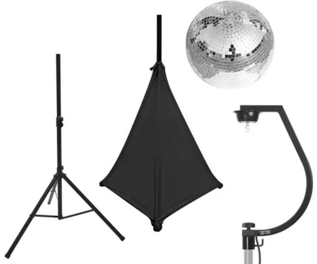 Tükörgolyó állványtartóval motorral, állvány vitorlával és hangszóró állvánnyal Tükörgolyó erős műanyag maggal Magas stabilitás a folytonos tengelyen keresztül Zökkenőmentes kötés Valódi üveglapok 10 x 10 mm Kiegészítő biztonsági fül a biztonsági lánchoz Alkalmazási területekhez, mint például: party pince; Klubok/tánciskolák Disco gömb Tükörgolyó állvá